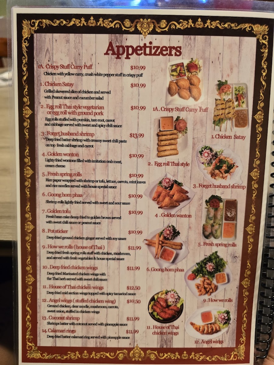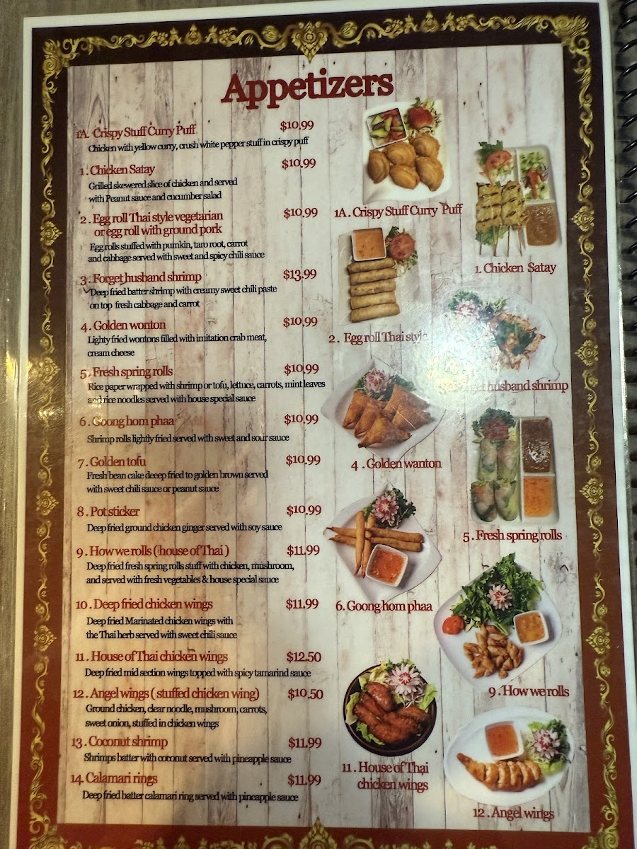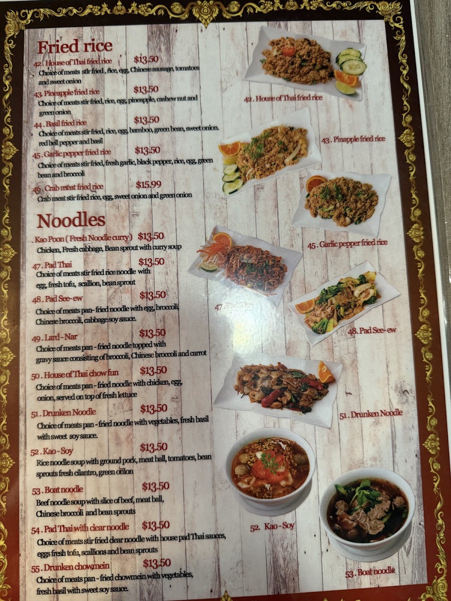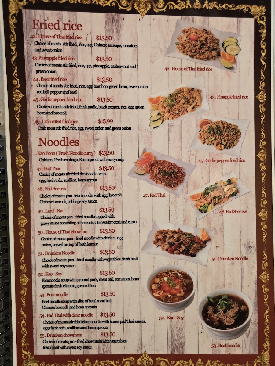 The menu at House Of Thai showcases an array of enticing dishes that celebrate the art of Thai cooking. From the moment you step in, the tantalizing aroma of fried rice fills the air, inviting you to dive into their signature offerings. Indulge in the House Of Thai Fried Rice, a masterful creation featuring your choice of meat combined with Chinese sausage, tomatoes, sweet and green onions, and perfectly scrambled eggs, all for just $15.63. If you're in the mood for something tropical, don’t miss the Pineapple Fried Rice with its fresh pineapple, cashew nuts, and sweet onions that meld together in harmonious flavors. Or if you're craving a hint of spice, the Basil Fried Rice is a delightful burst of freshness with green beans, bamboo shoots, carrots, and red bell pepper.